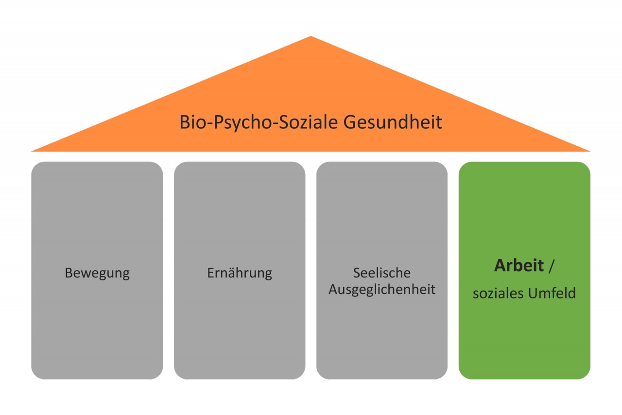 Die Gesundheitsförderung bietet Ihnen vier Handlungsebenen an: Bewegung, Ernährung, seelische Ausgeglichenheit sowie Arbeit und Soziales.